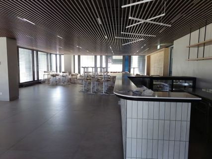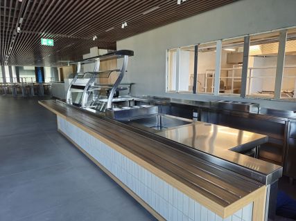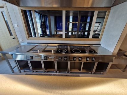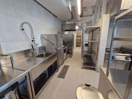 Kuhinja je opremljena vrhunskim uređajima renomiranih proizvođača, prilagođenim svakodnevnim potrebama zaposlenika i organizaciji pripreme obroka u većem sustavu.